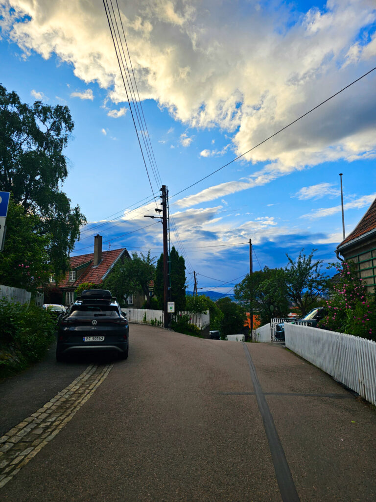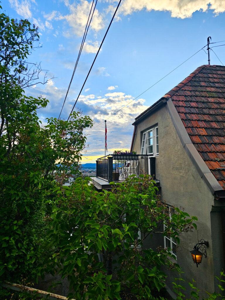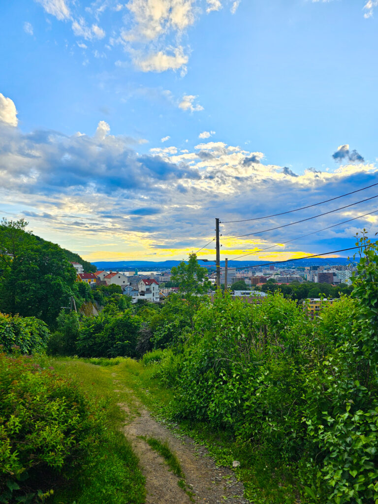 Kävelimme hiljalleen keskustan läpi takaisin Gamle Oslossa sijainneeseen asuntoomme. Ensimmäisen päivän innostus kaikesta uudesta, yllättävä kuumuus ja edellisen yön vähäiseksi jääneet unet iskivät päälle kertarysäyksellä ja ”kotiin” päästessä oli pakko ottaa rennommin. Parin tunnin lepäily Frediä rapsutellen, ruokaa syöden ja telkkaria katsoen teki hyvää. Illalla askelmittarien paukkumisesta huolimatta lähdimme vielä kävelylle Gamle Oslon ympäristöön. Pääsimme kipuamaan mäkiä pitkin ylös niin, että edessämme avautui näköala kaupunkiin.
