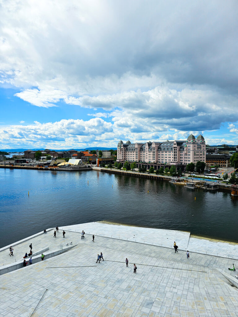 Ensimmäisenä päivänä teimme saman kuin lähes joka reissulla: käytimme ekan päivän kaupunkiin tutustumiseen jalkaisin. Musta on parasta uudessa paikassa vaan kävellä ympäriinsä ja katsella ympärilleen. Niin sanotusti haistella tunnelmaa. Oslossa lähes kaikki on mukavasti kävelyetäisyyden päässä, joten päämäärätön kiertely toimii hyvin. Kävimme ihastelemassa Oslon oopperataloa ulkoapäin. Tiesittekö, että oopperatalon katolle voi ja saa kiivetä? Katto on viistossa ja sitä kulkeminen on suhteellisen helppoa ainakin toimivilla jaloilla. Oopperatalon katolta on mukavat maisemat merelle päin.