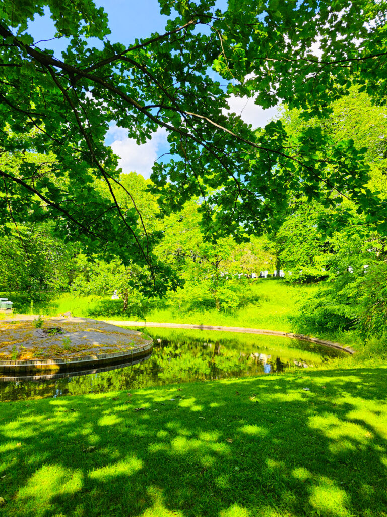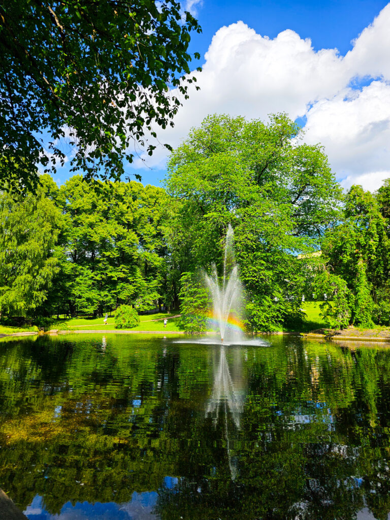 Jatkoimme kävelyä kohti vilkkaita ostoskatuja ja niitä pitkin ihmismassojen mukana, kunnes tupsahdimme hyvin näyttävän rakennuksen pihaan. Pienen googlailun jälkeen selvisi kyseisen majan olevan Kuninkaanlinna. Istuimme sen edessä penkeillä ja siemailimme matkalta hakemiamme smoothieita. Koko viikoksi oli luvattu pilvistä ja sateista keliä, mutta maanantaina aurinko porotti polttavana pilveettömältä taivaalta. Hengähdyshetki kuninkaallisilla penkeillä teki hyvää, ja kiersimme vielä linnan takana olevassa puutarhassa. Puistomaisella alueella näkyi lammen rannasta nauttivia eväsretkeilijöitä, ja paikka oli kieltämättä idyllinen puistossa istuskelua haluaville.